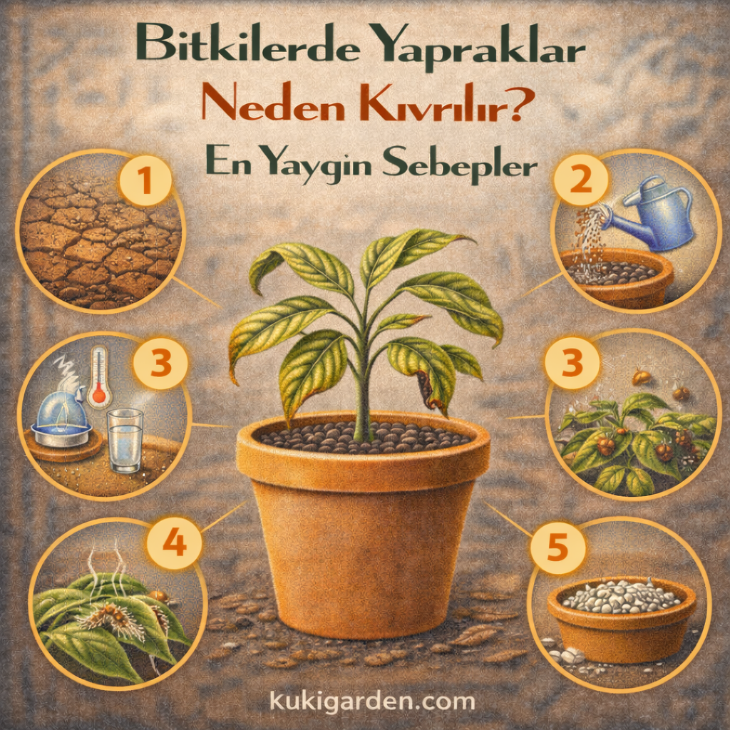 Yaprakların içe doğru kıvrılması, bükülmesi veya kenarlardan “toplanması” çoğu zaman bitkinin stres altında olduğunu gösterir. Bu stres genellikle su dengesi, nem, ışık veya zararlılar kaynaklıdır. Doğru nedeni bulduğunuzda bitki çoğu zaman kısa sürede toparlanır.